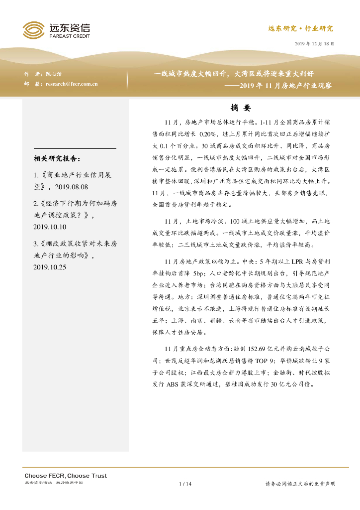 远东资信:一线城市热度大幅回升,大湾区或将迎来重大利好——2019年11月房地产行业观察报告.pdf