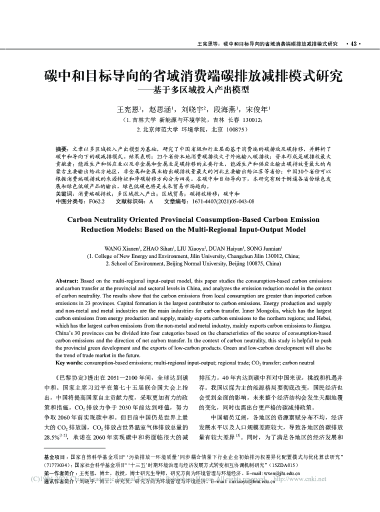 碳中和目标导向的省域消费端碳排放减排模式研究-基于多区域投入产出模型.pdf