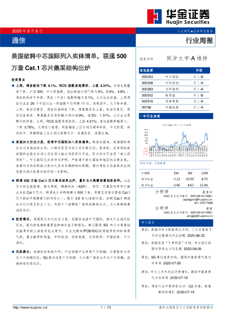 华金证券:通信行业周报:美国欲将中芯国际列入实体清单,联通500万套Cat.1芯片集采结构出炉.pdf