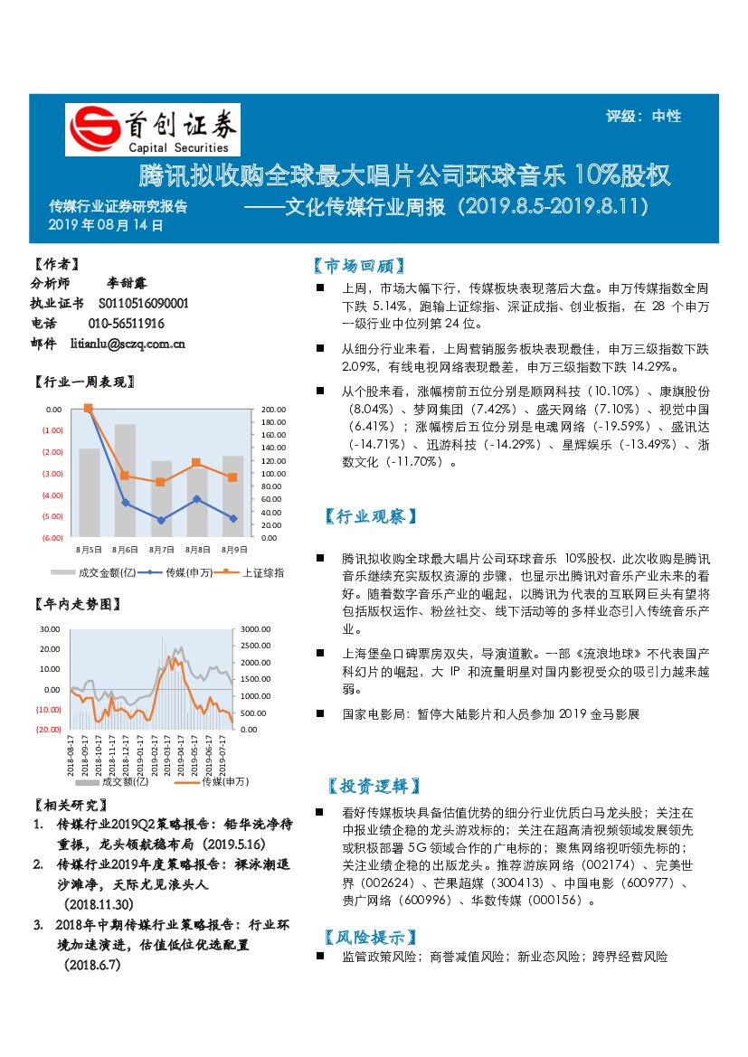 首创证券:文化传媒行业周报:腾讯拟收购全球最大唱片公司环球音乐10%股权.pdf