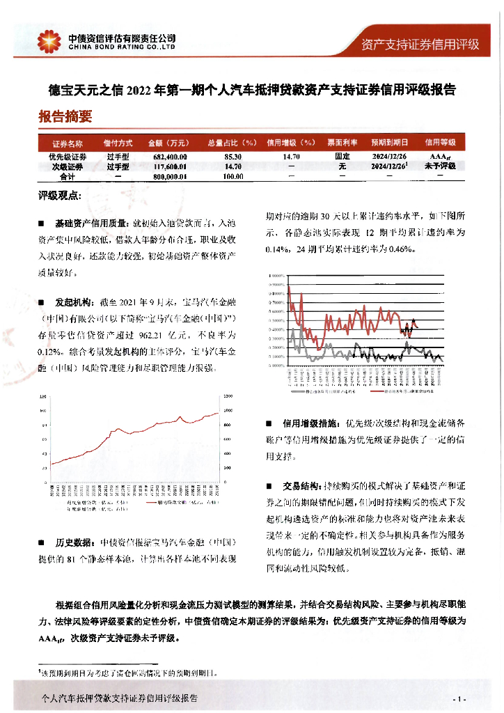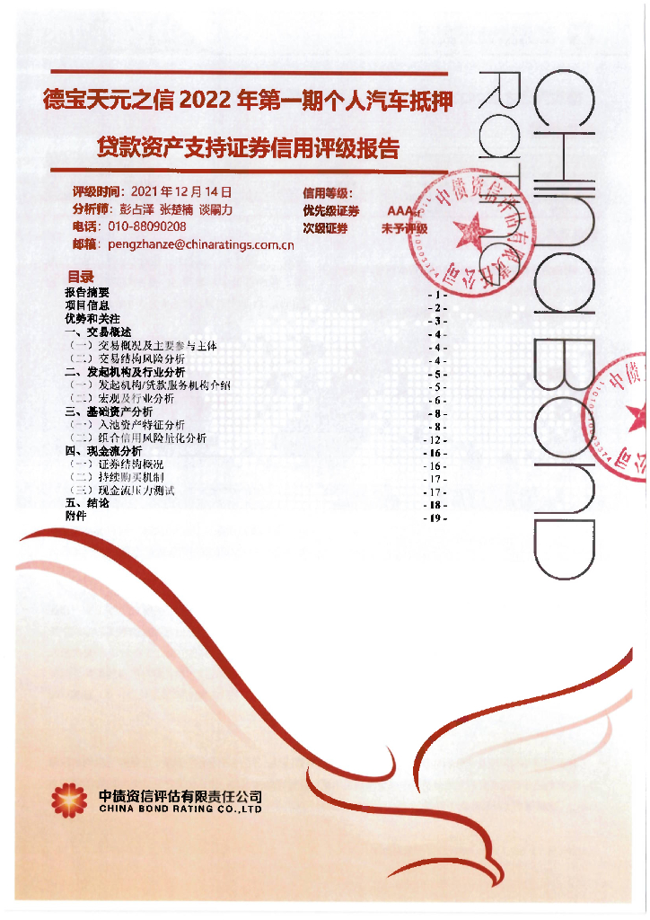 中债资信:德宝天元之信2022年第一期个人汽车抵押贷款资产支持证券信用评级报告及跟踪评级安排.pdf