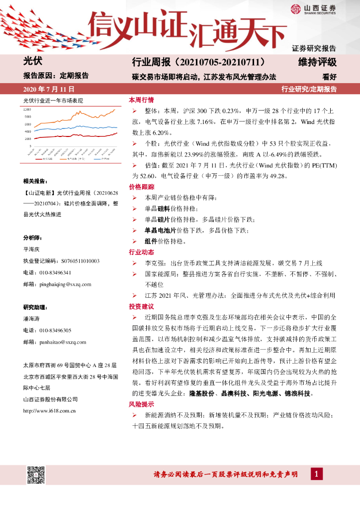 山西证券:光伏行业周报:碳交易市场即将启动,江苏发布风光管理办法.pdf