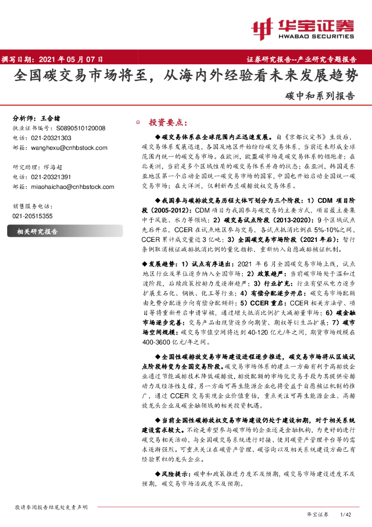 华宝证券:碳中和系列报告:全国碳交易市场将至,从海内外经验看未来发展趋势.pdf