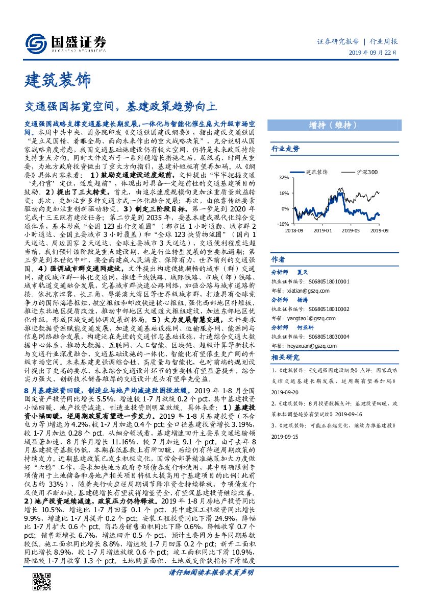 国盛证券:建筑装饰行业周报:交通强国拓宽空间,基建政策趋势向上.pdf