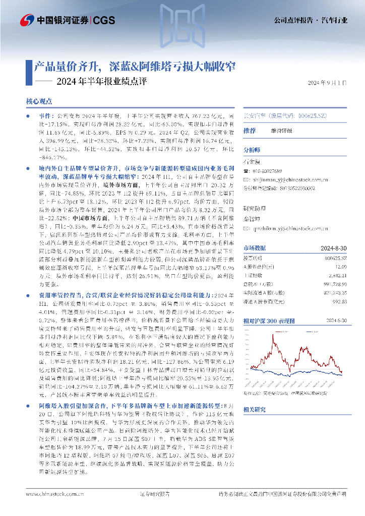 中国银河:长安汽车(000625)-2024年半年报业绩点评:产品量价齐升,深蓝&阿维塔亏损大幅收窄.pdf