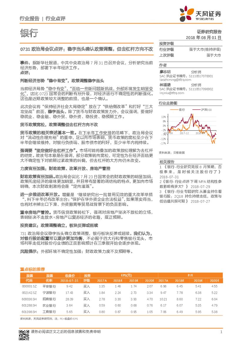 天风证券:银行:0731政治局会议点评:稳字当头确认政策调整,但去杠杆方向不改.pdf
