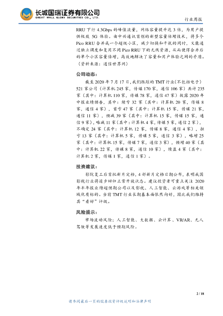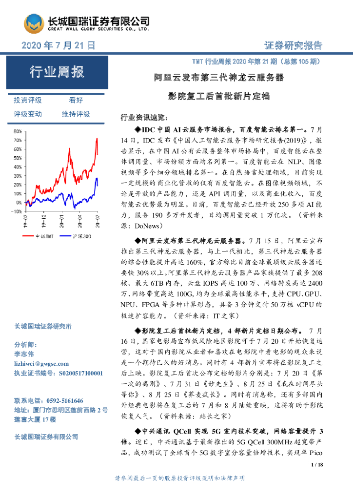 长城国瑞证券:TMT行业周报2020年第21期(总第105期):阿里云发布第三代神龙云服务器 影院复工后首批新片定档.pdf
