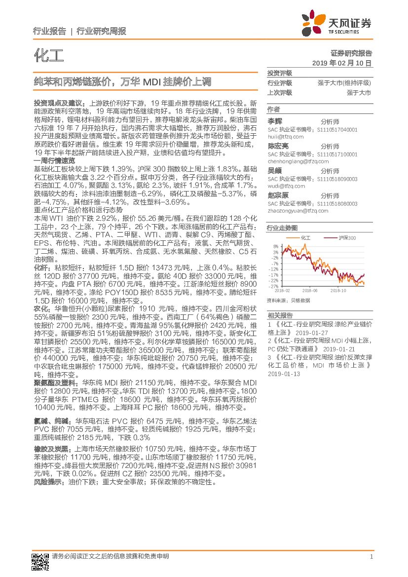 天风证券:化工行业研究周报:纯苯和丙烯链涨价,万华MDI挂牌价上调.pdf