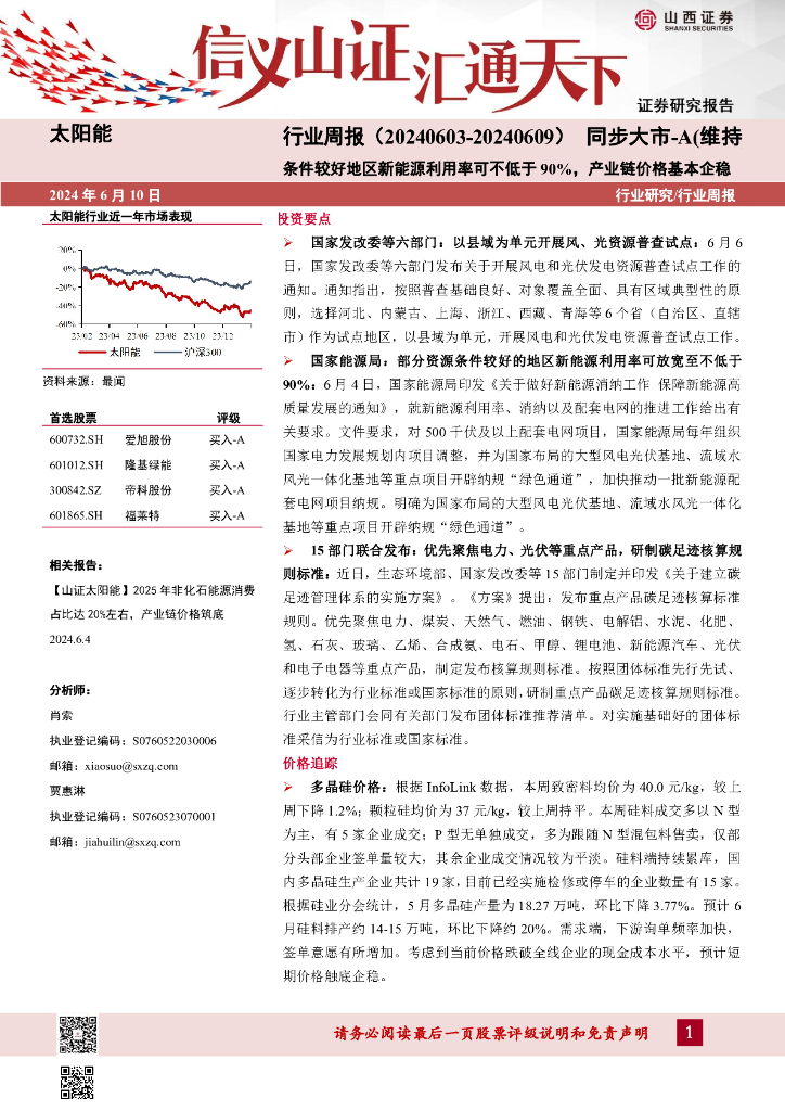 山西证券:太阳能行业周报:条件较好地区新能源利用率可不低于90%,产业链价格基本企稳.pdf