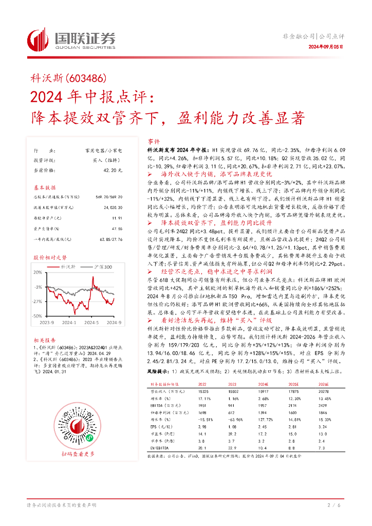 国联证券:科沃斯(603486)-2024年中报点评:降本提效双管齐下,盈利能力改善显著.pdf