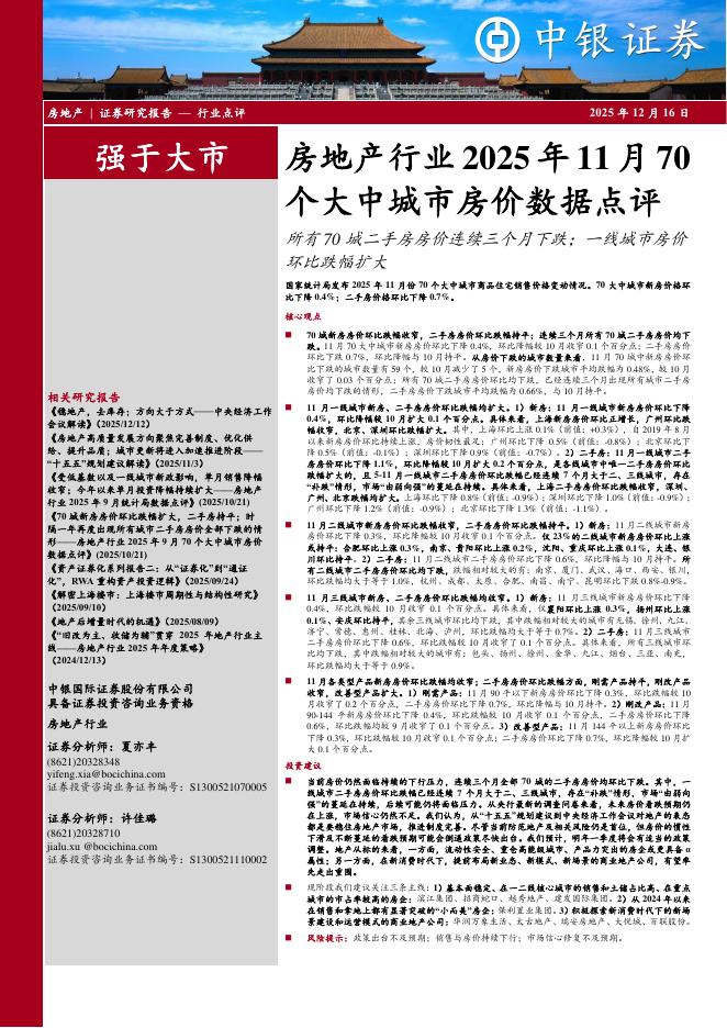 中银证券:房地产行业2025年11月70个大中城市房价数据点评:所有70城二手房房价连续三个月下跌;一线城市房价环比跌幅扩大.pdf