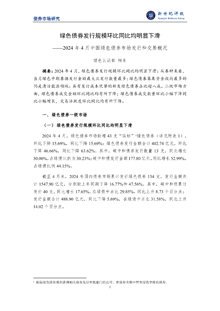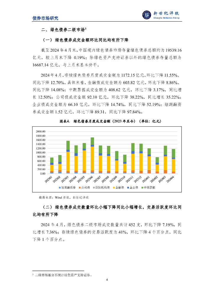 新世纪评级:绿色债券发行规模环比同比均明显下滑——2024年4月中国绿色债券市场发行和交易概况.pdf