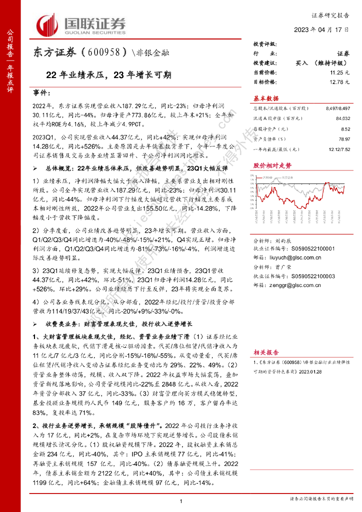 国联证券:东方证券(600958)-22年业绩承压,23年增长可期.pdf