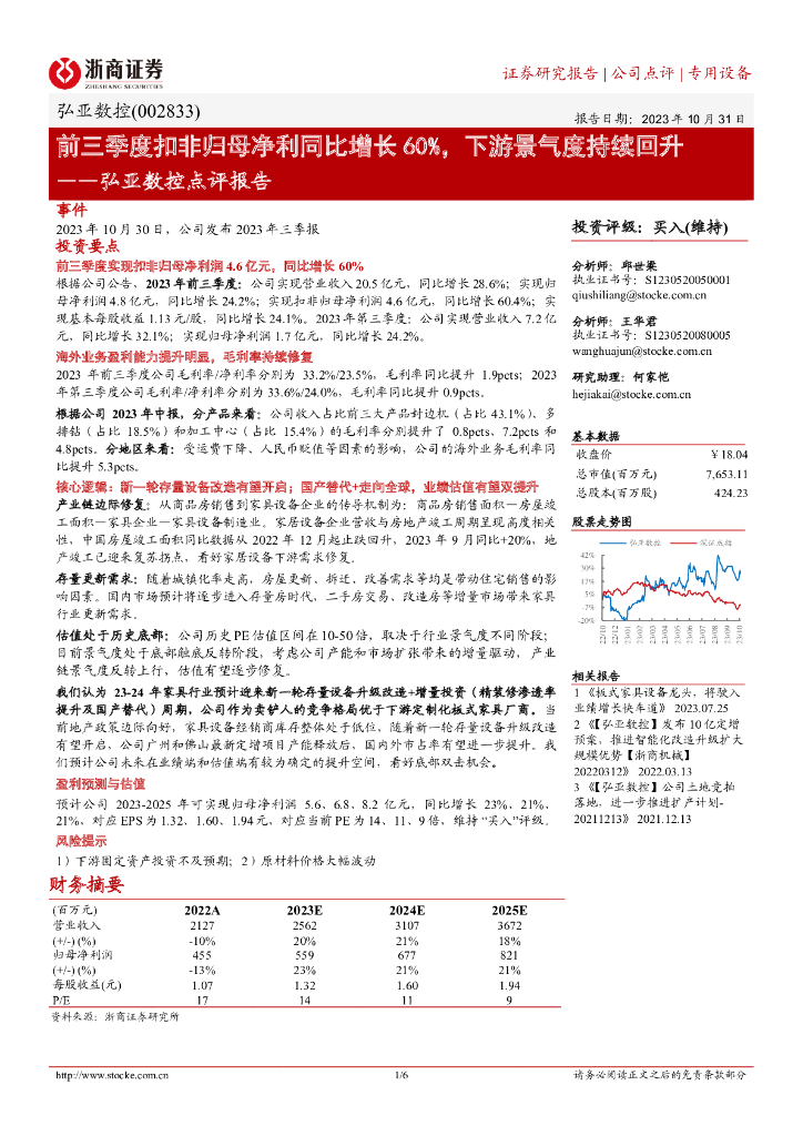 浙商证券:弘亚数控(002833)-前三季度扣非归母净利同比增长60%,下游景气度持续回升.pdf