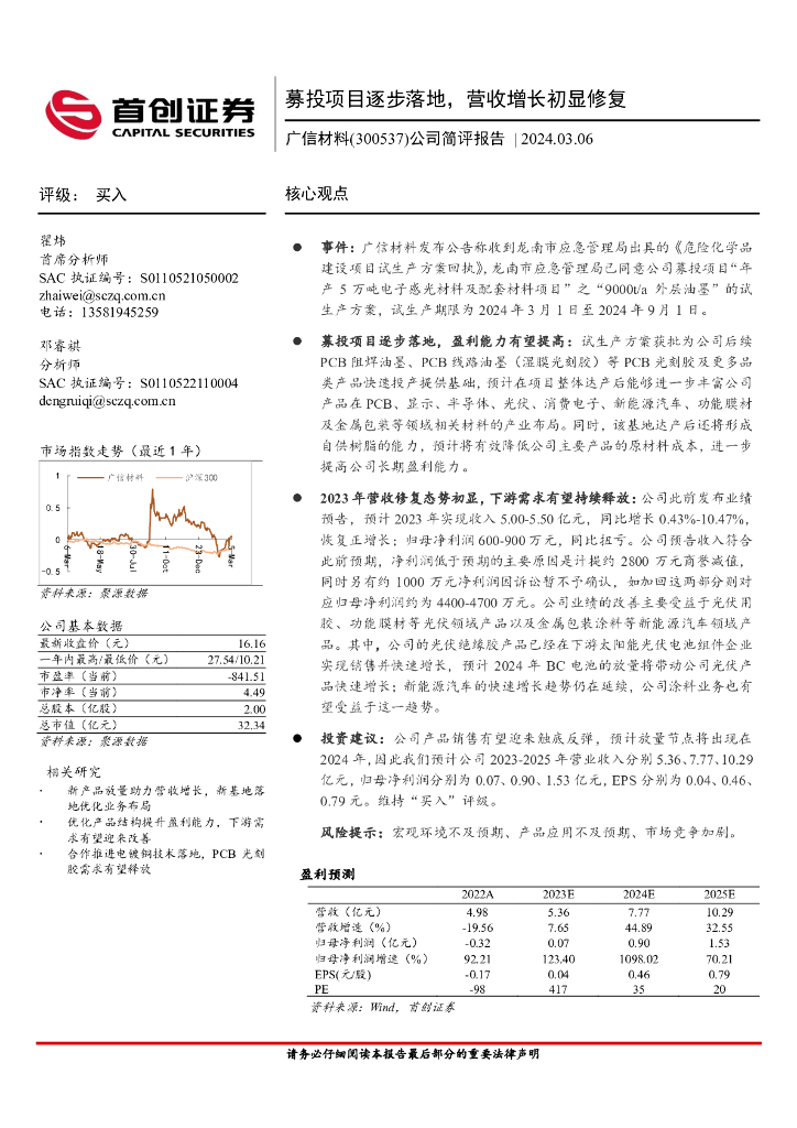 首创证券:广信材料(300537)-公司简评报告:募投项目逐步落地,营收增长初显修复.pdf
