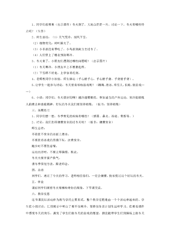 2021一年级上册 人教版小学道德与法治《14 健康过冬天》教学设计(1).doc