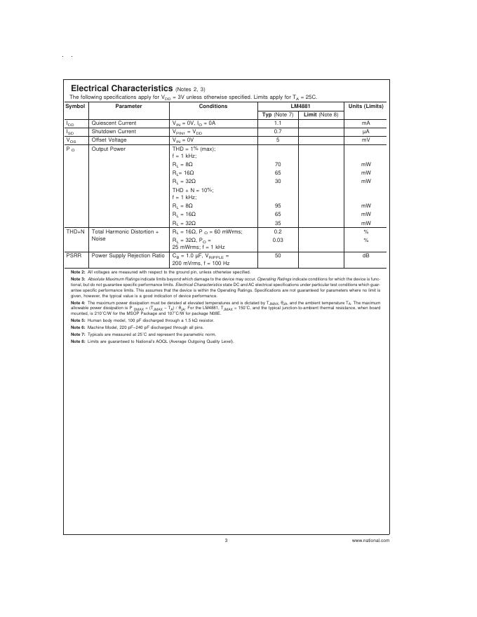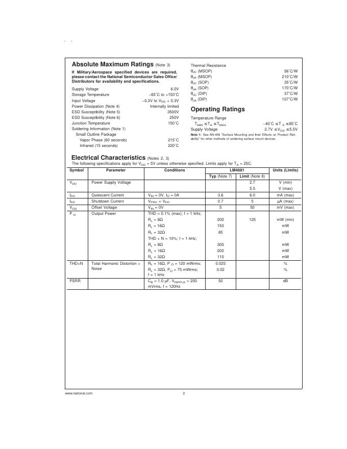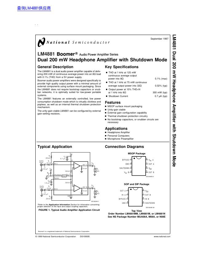 National semiconductor LM4881 Dual 200 mW Headphone Amplifier with Shutdown Mode 数据手册.pdf