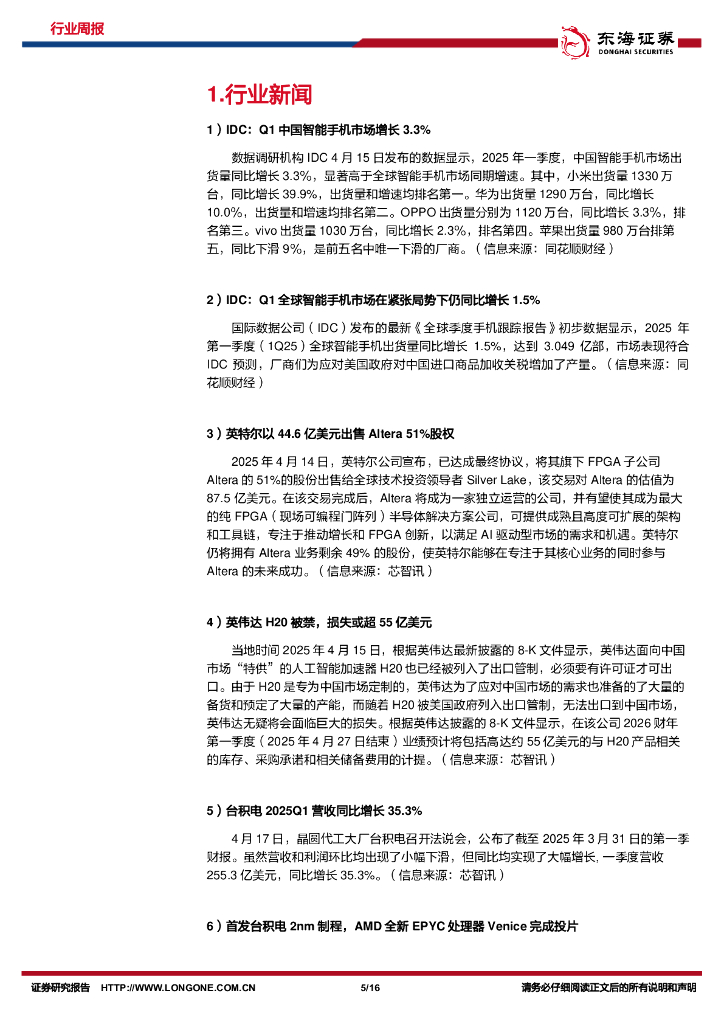 东海证券:电子行业周报:2025Q1国内智能手机出货量增速超越全球市场,AI需求拉动台积电Q1业绩增长.pdf