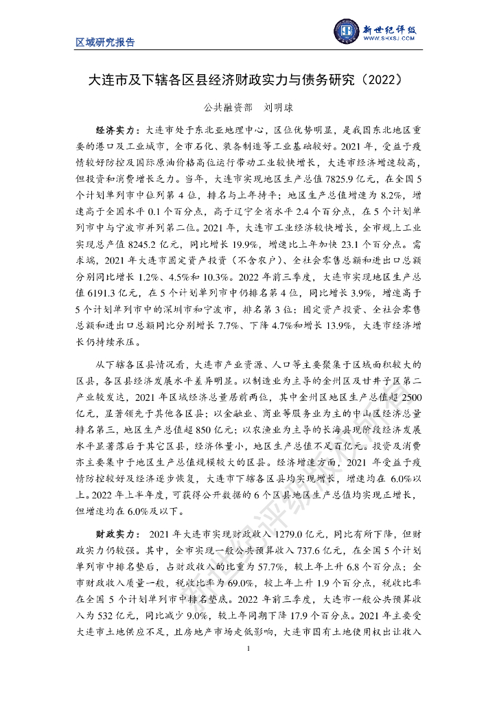 新世纪评级:大连市及下辖各区县经济财政实力与债务研究(2022).pdf