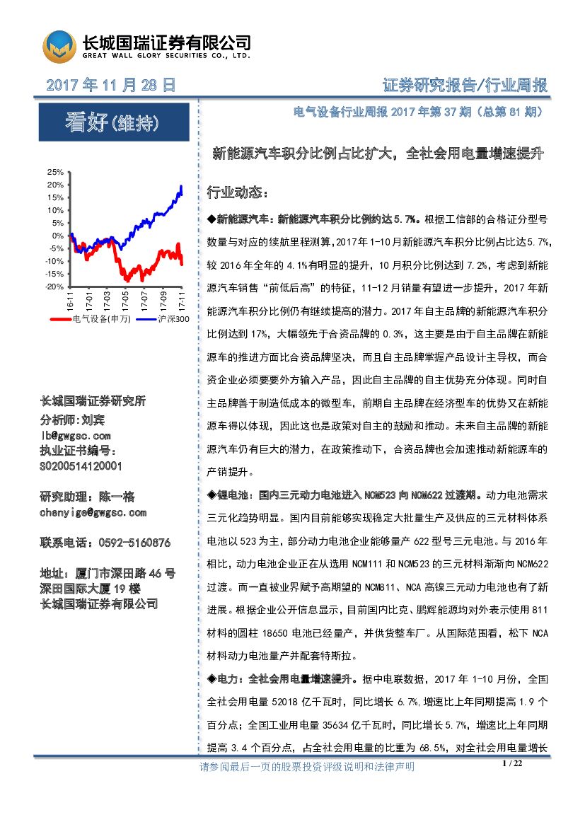 长城国瑞证券:电气设备行业周报:新能源汽车积分比例占比扩大,全社会用电量增速提升.pdf