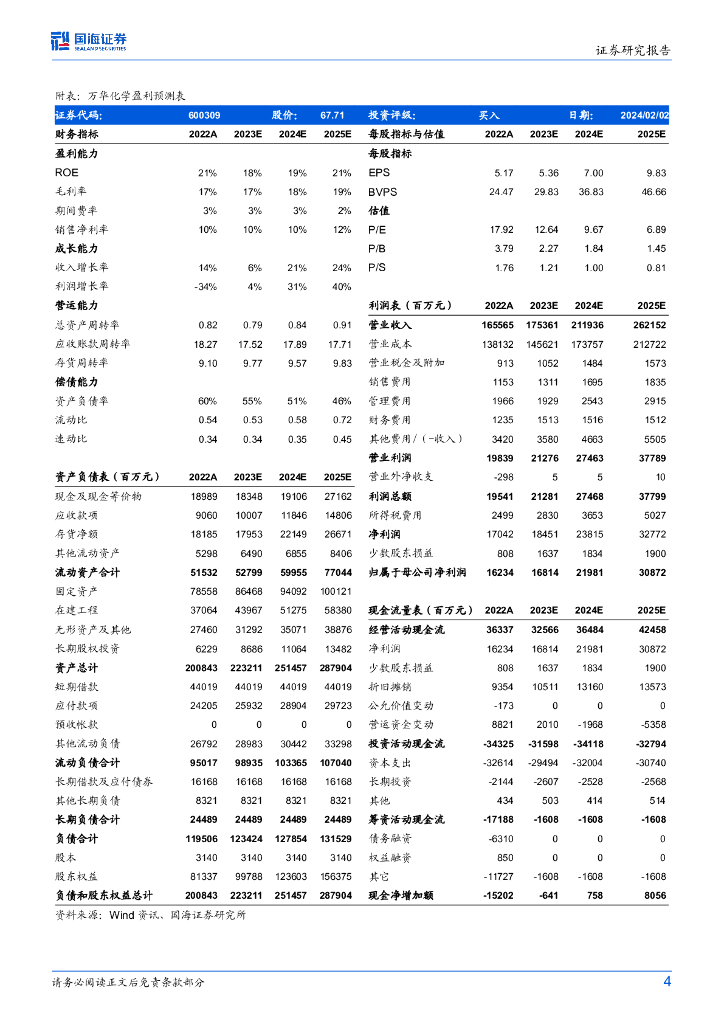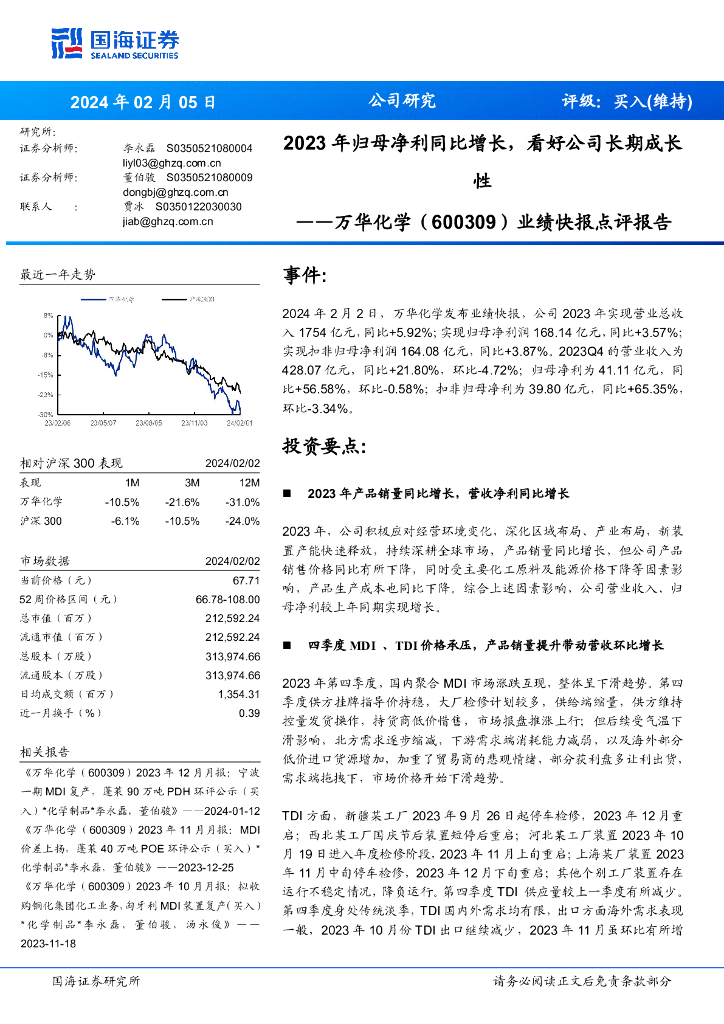 国海证券:万华化学(600309)-业绩快报点评报告:2023年归母净利同比增长,看好公司长期成长.pdf