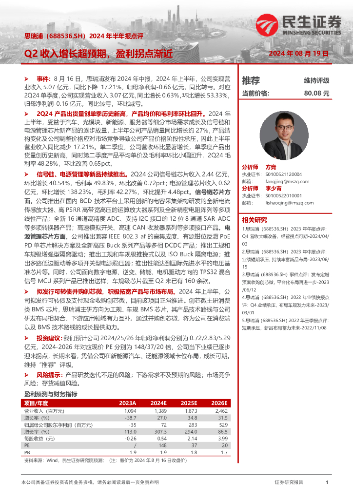 民生证券:思瑞浦(688536)-2024年半年报点评:Q2收入增长超预期,盈利拐点渐近.pdf