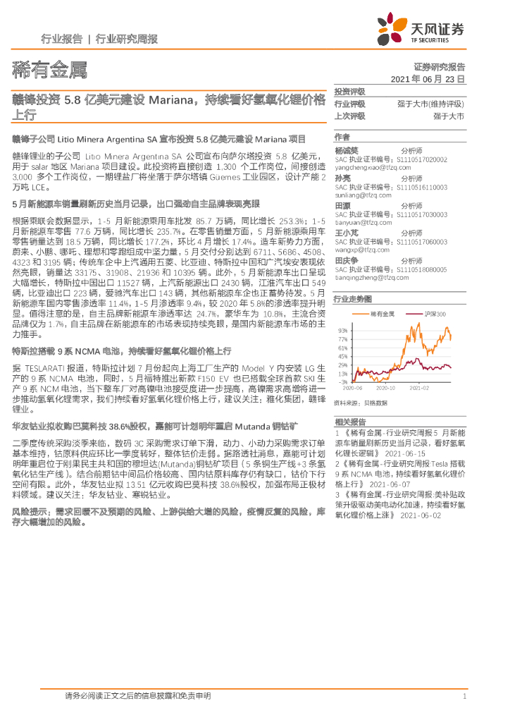 天风证券:稀有金属行业研究周报:赣锋投资5.8亿美元建设Mariana,持续看好氢氧化锂价格上行.pdf