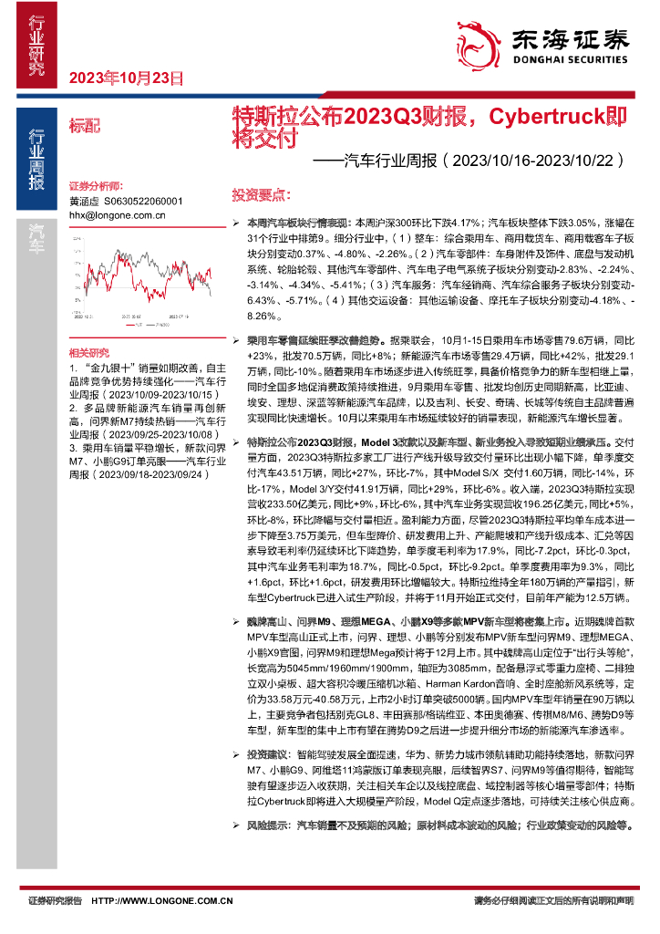 东海证券:汽车行业周报:特斯拉公布2023Q3财报,Cybertruck即将交付.pdf