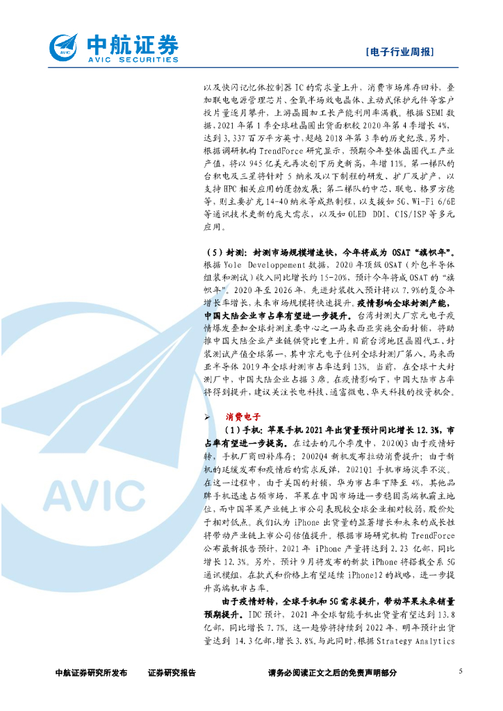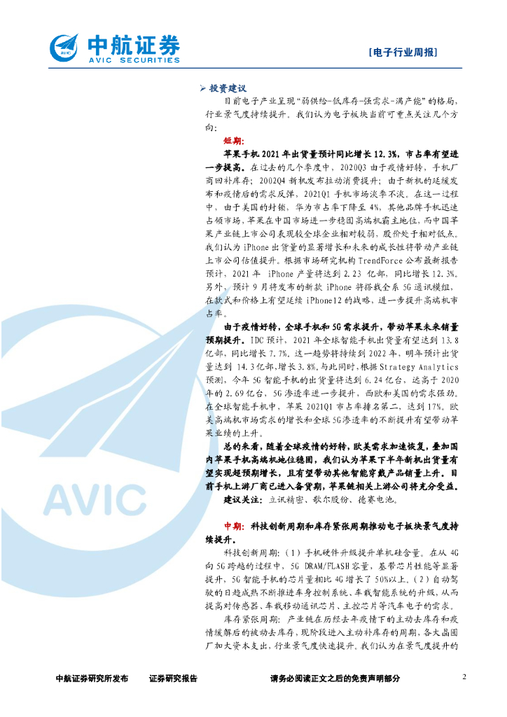中航证券:电子行业周报:苹果手机2021年出货量预计同比增长12.3%,看好苹果链上市企业.pdf