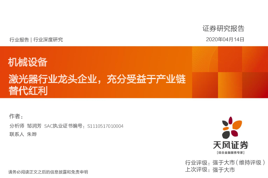 天风证券:机械设备行业深度研究:激光器行业龙头企业,充分受益于产业链替代红利.pdf
