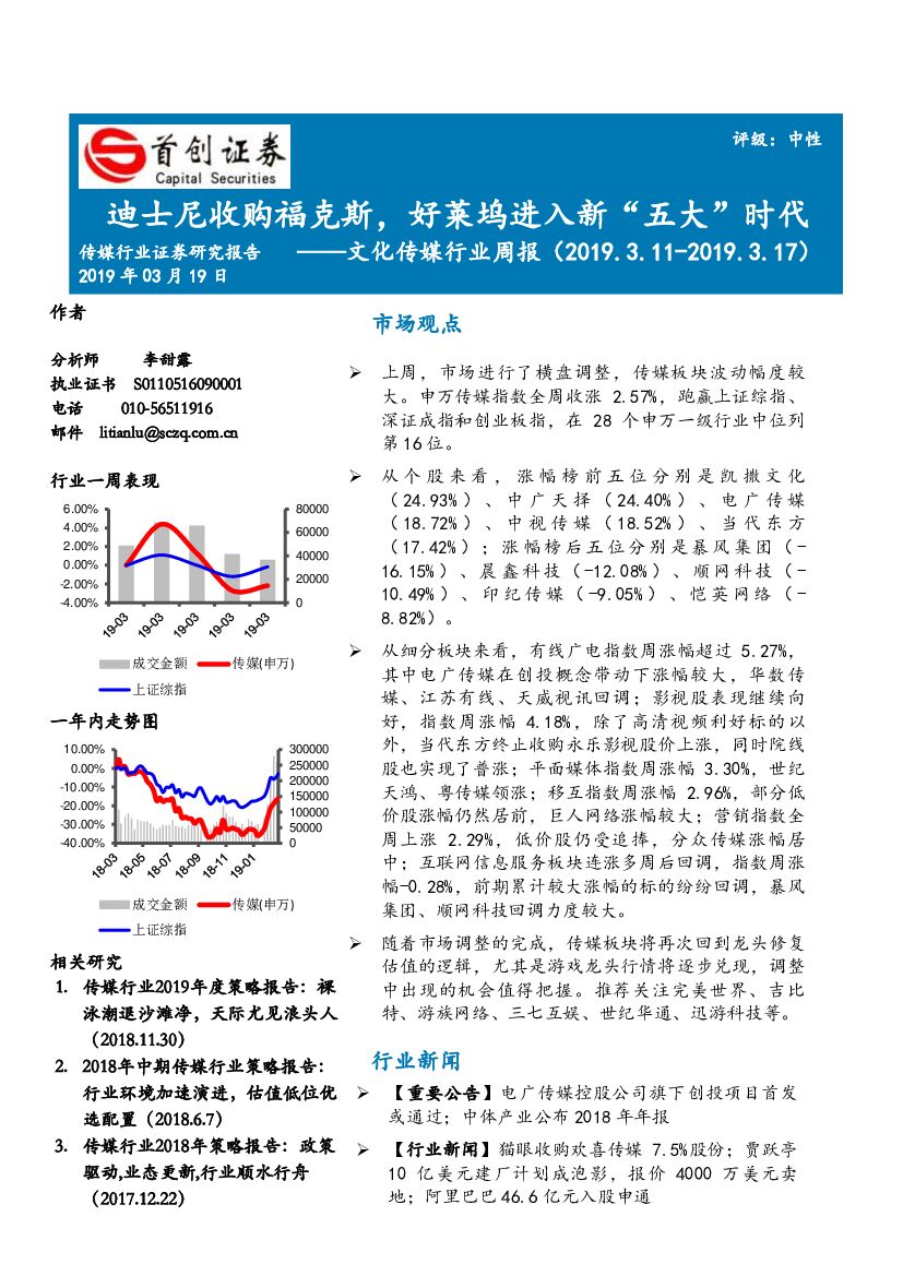 首创证券:文化传媒行业周报:迪士尼收购福克斯,好莱坞进入新“五大”时代.pdf