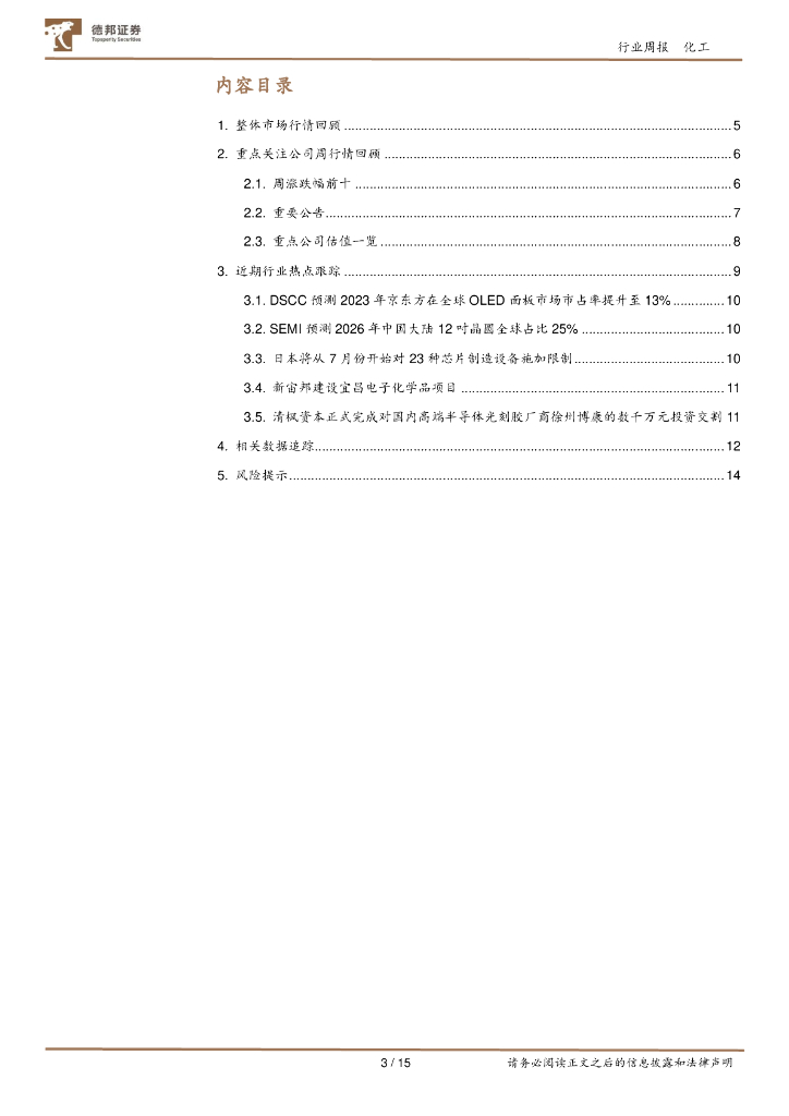德邦证券:化工新材料行业周报:DSCC预测2023年京东方在全球OLED面板市场市占率提升至13%,SEMI预测2026年中国大陆12吋晶圆全球占比25%.pdf
