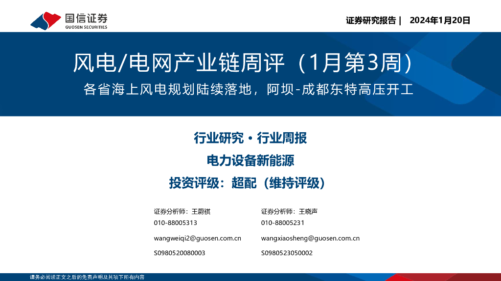 国信证券:风电/电网产业链周评(1月第3周):各省海上风电规划陆续落地,阿坝-成都东特高压开工.pdf