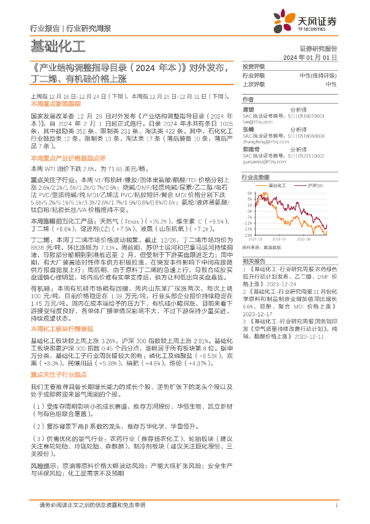 天风证券:基础化工行业研究周报:《产业结构调整指导目录(2024年本)》对外发布,丁二烯、有机硅价格上涨.pdf