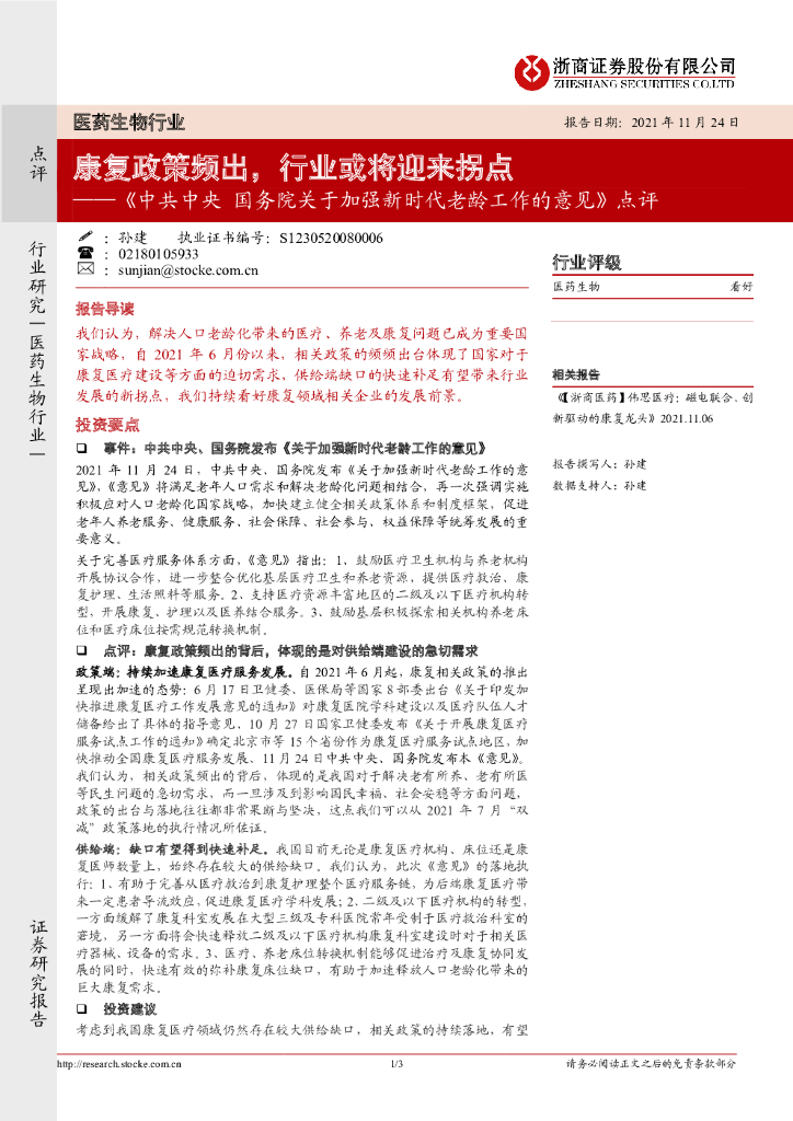 浙商证券:医药生物行业:《中共中央国务院关于加强新时代老龄工作的意见》点评-康复政策频出,行业或将迎来拐点.pdf