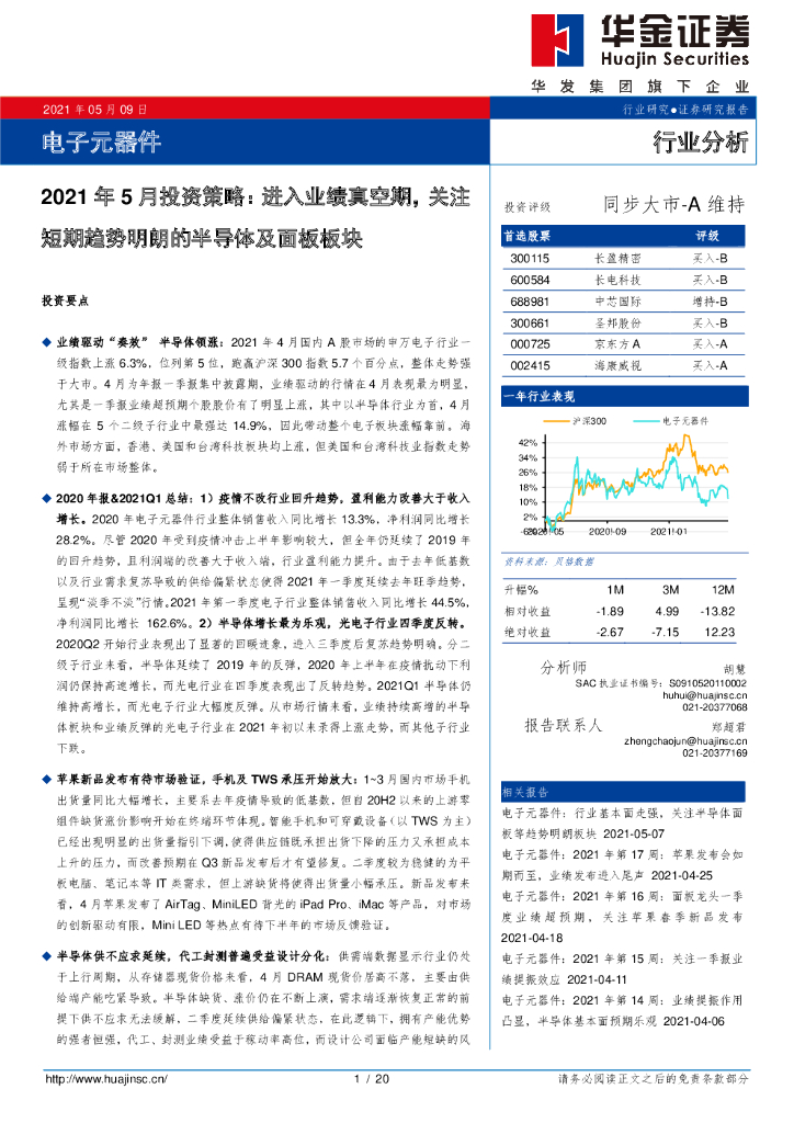 华金证券:电子元器件:2021年5月投资策略:进入业绩真空期,关注短期趋势明朗的半导体及面板板块.pdf