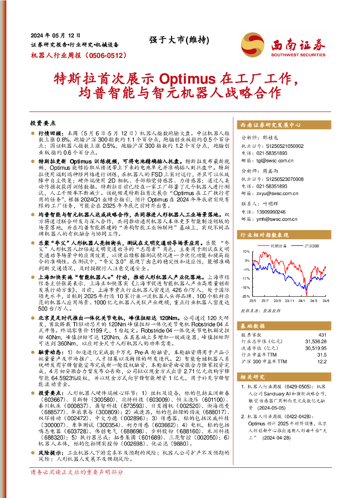 西南证券:机器人行业周报:特斯拉首次展示Optimus在工厂工作,均普智能与智元机器人战略合作.pdf