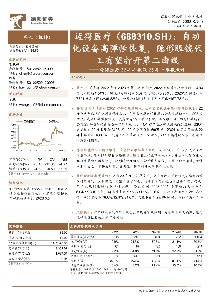 德邦证券:迈得医疗22年年报及23年一季报点评:自动化设备高弹性恢复,隐形眼镜代工有望打开第二曲线.pdf