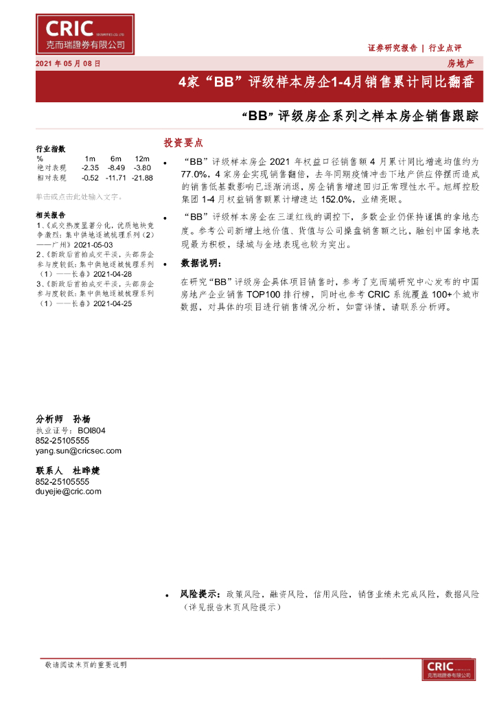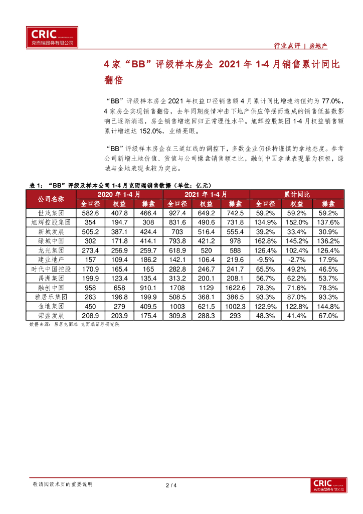 克而瑞证券:“BB”评级房企系列之样本房企销售跟踪:4家“BB”评级样本房企1-4月销售累计同比翻番.pdf