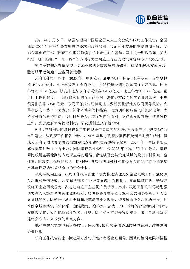 联合资信:2025年两会建筑行业政策解读:基建端建筑需求有望修复,“防风险”助力建筑企业流动性改善.pdf