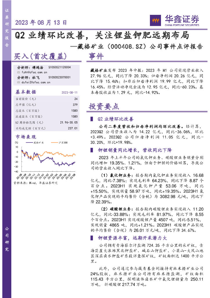 华鑫证券:藏格矿业(000408)-公司事件点评报告:Q2业绩环比改善,关注锂盐钾肥远期布局.pdf