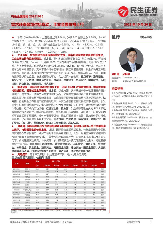 民生证券:有色金属周报:需求旺季叠加供给扰动,工业金属价格上行.pdf