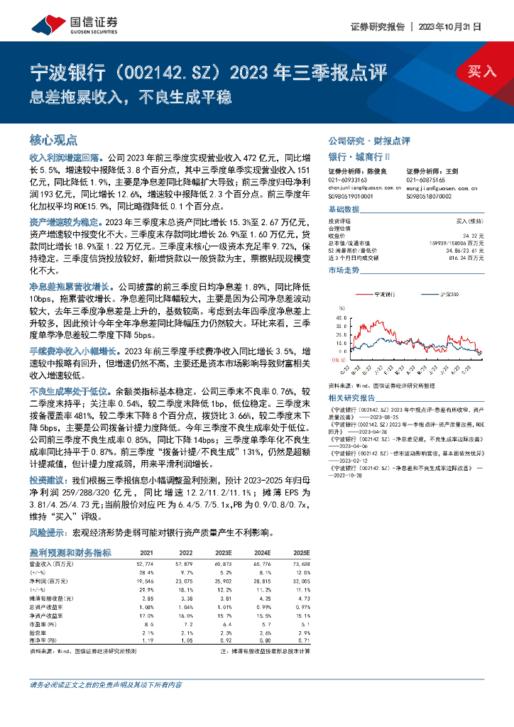 国信证券:宁波银行(002142)-2023年三季报点评:息差拖累收入,不良生成平稳.pdf