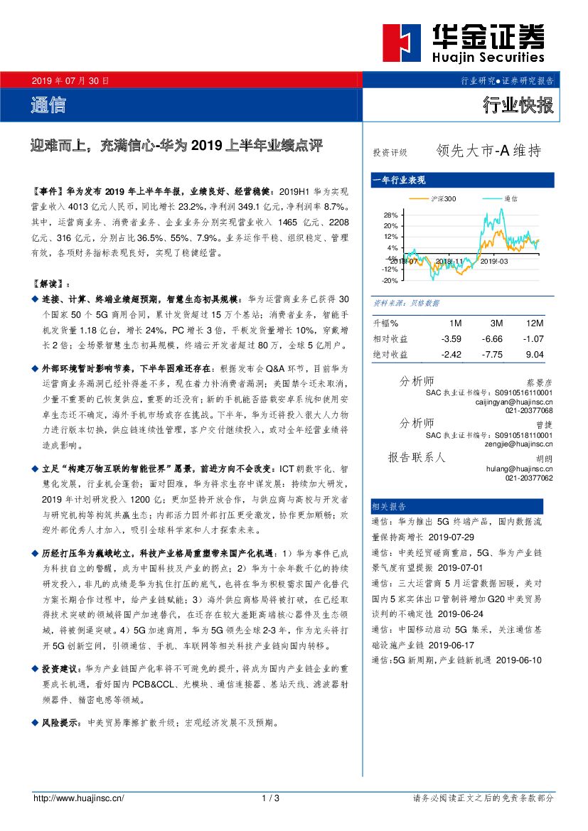 华金证券:通信行业快报:迎难而上,充满信心-华为2019上半年业绩点评.pdf