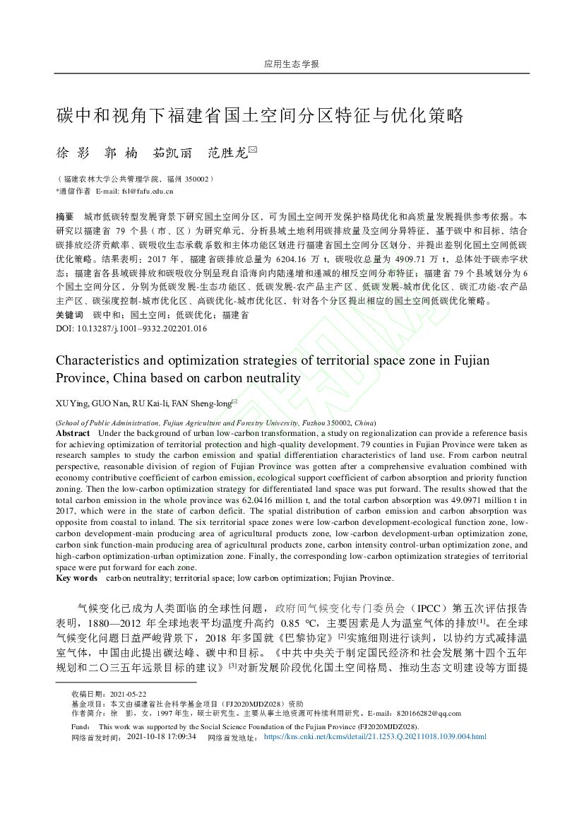 福建农林大学:碳中和视角下福建省国土空间分区特征与优化策略.pdf