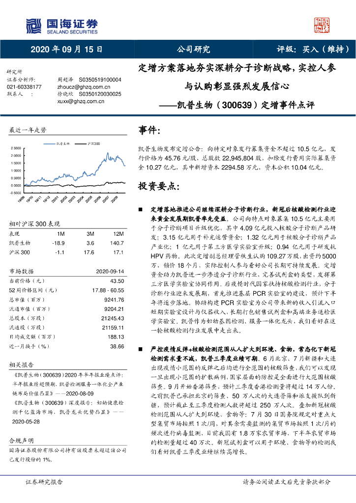 国海证券:凯普生物(300639)-定增事件点评:定增方案落地夯实深耕分子诊断战略,实控人参与认购彰显强烈发展信心.pdf