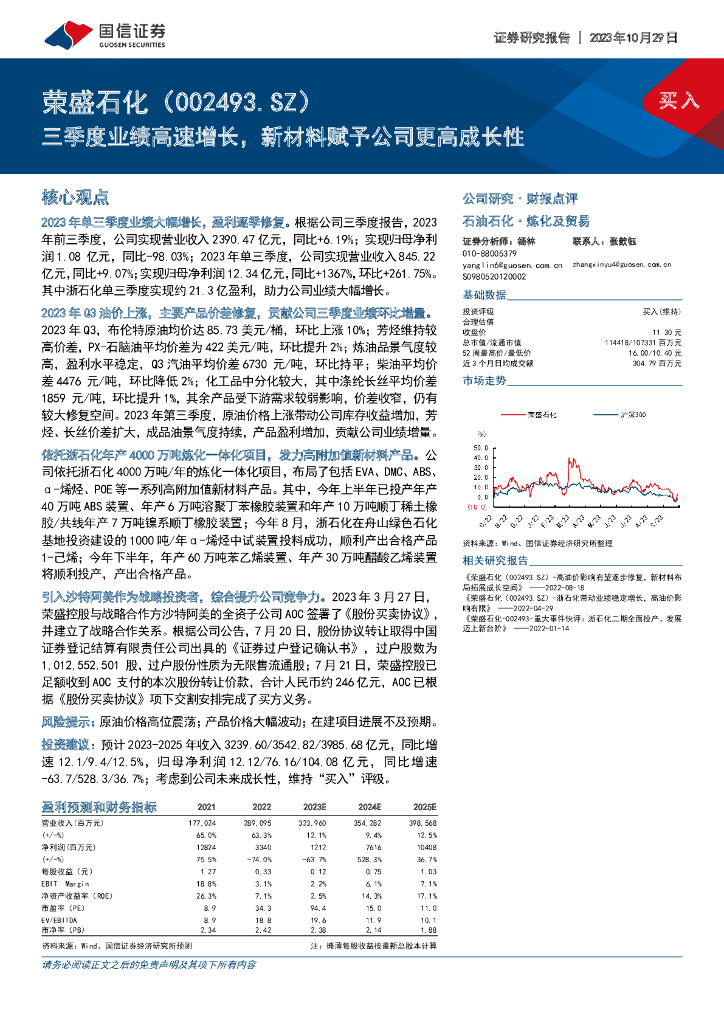 国信证券:荣盛石化(002493)-三季度业绩高速增长,新材料赋予公司更高成长性.pdf