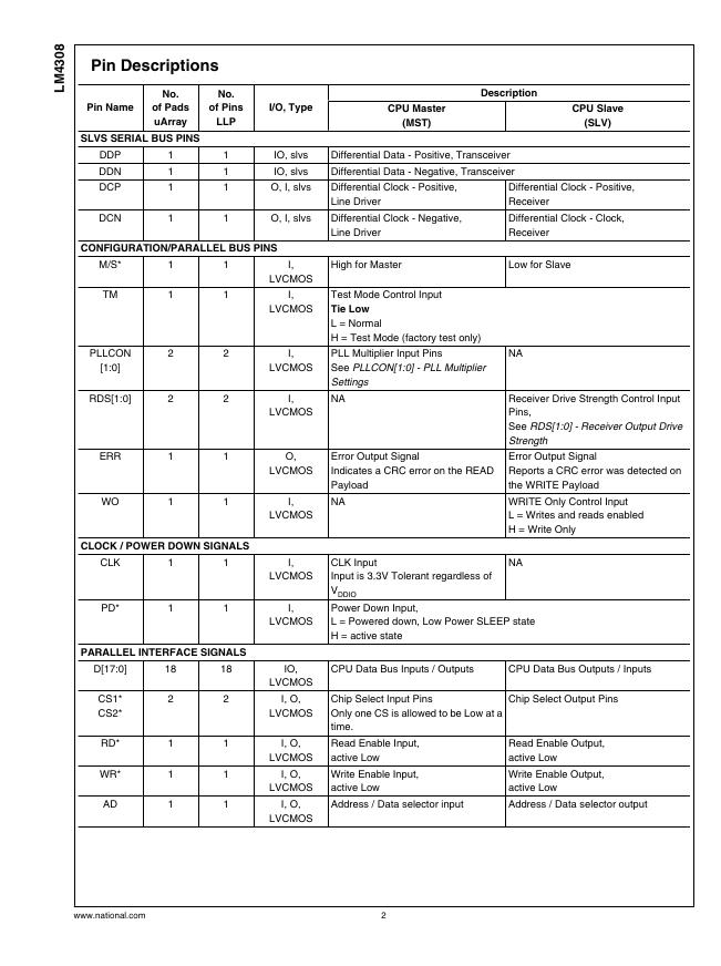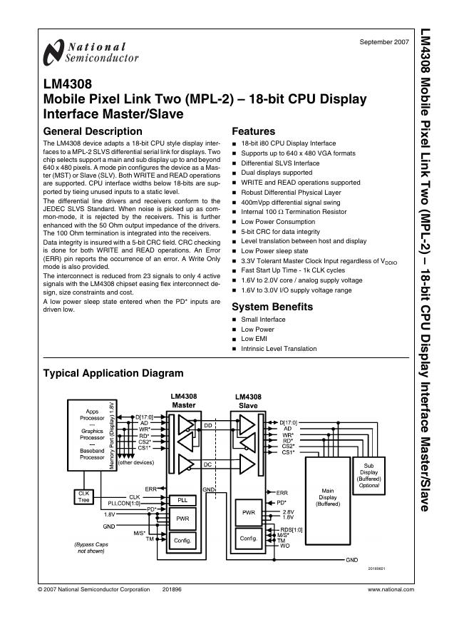 NATIONAL SEMICONDUCTOR - LM4308 Mobile Pixel Link Two (MPL-2) – 18-bit CPU Display Interface Master/Slave 数据手册.pdf