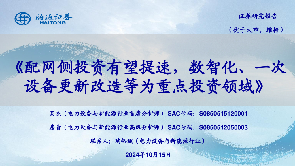 海通证券:电力设备与新能源行业:配网侧投资有望提速,数智化、一次设备更新改造等为重点投资领域.pdf