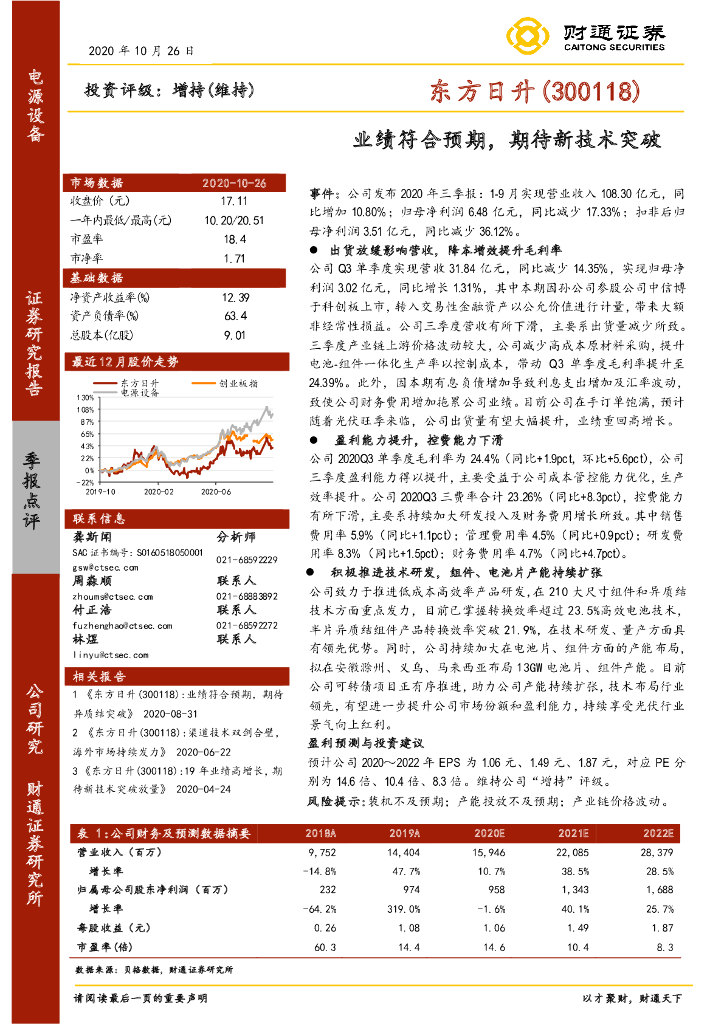 财通证券:东方日升(300118)-业绩符合预期,期待新技术突破.pdf